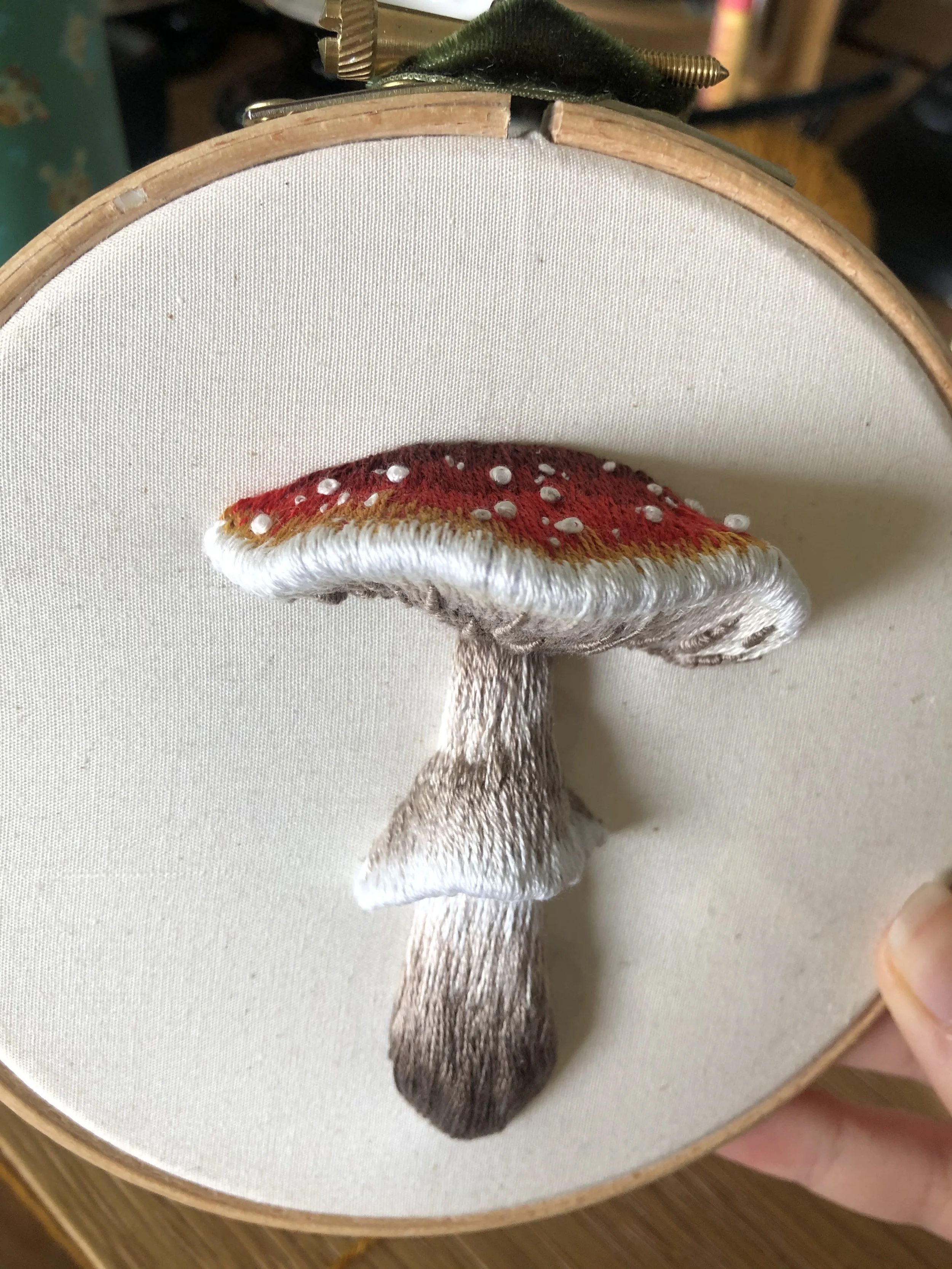This piece was difficult to capture digitally. I am a writer not a photographer but hopefully you can still see how it’s 3D. I used an embroidery technique called “stumpwork” to create that pop-out effect. It makes for such a charming little piece of art. The pattern for this is by embroidery artist Pippa Haynes whose work, centered around flowers and fungi, is a constant inspiration to me.