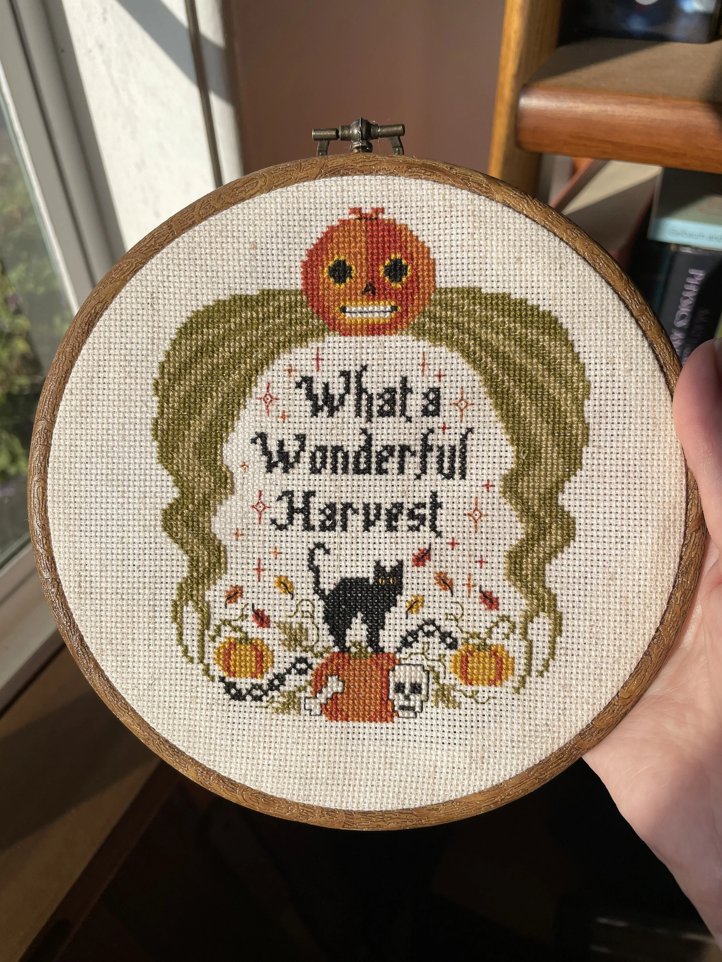 This is a cross-stitch I completed in October of 2021. The pattern was created by one of my favorite fiber artists Beast or God as part of a stitch-a-long that took place over the Halloween season. It’s based on one of my favorite shows Over the Garden wall and was my first real attempt at cross-stitch.